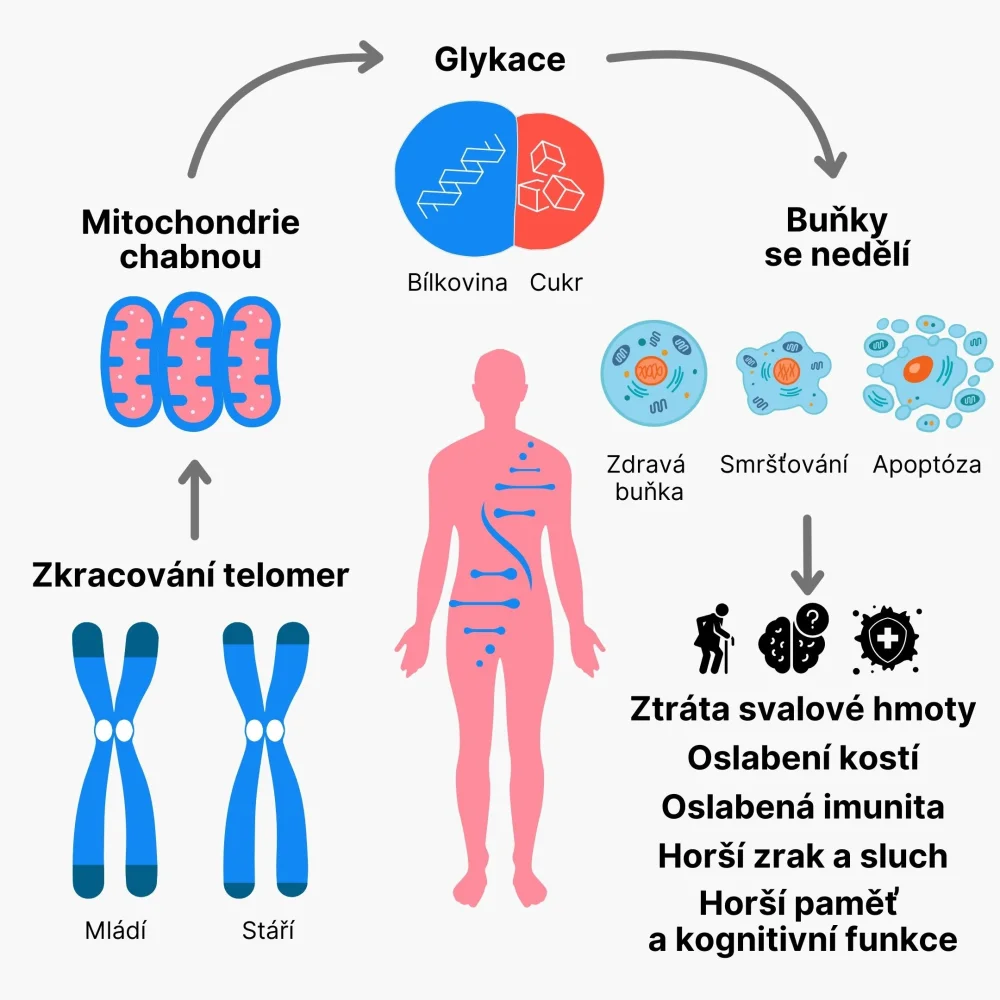 Le vieillissement est un processus biologique naturel. Il entraîne des dommages aux mitochondries, la glycation des protéines et le raccourcissement des télomères. Cela conduit à l'accumulation de cellules et de tissus endommagés et par la suite aux manifestations du vieillissement – de l'énergie réduite et d'une moins bonne régénération à la détérioration de la mémoire, de l'immunité ou de la qualité de la peau.