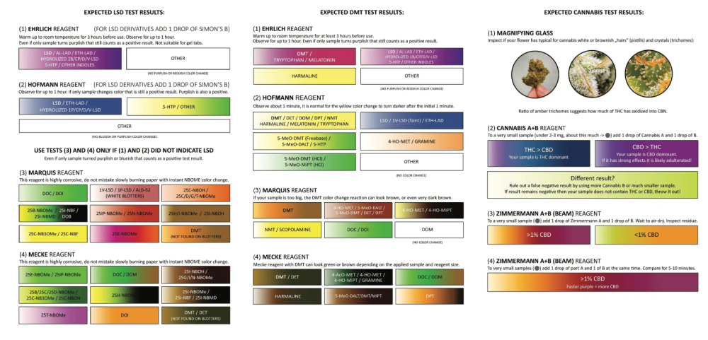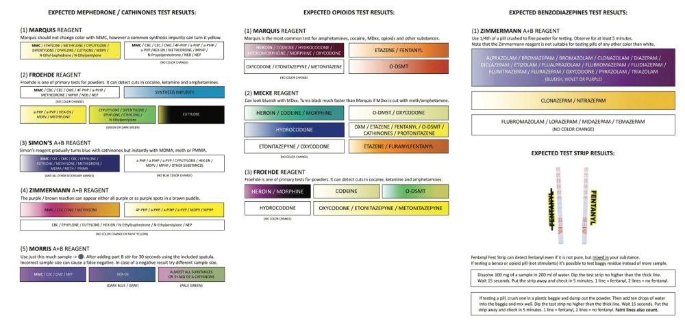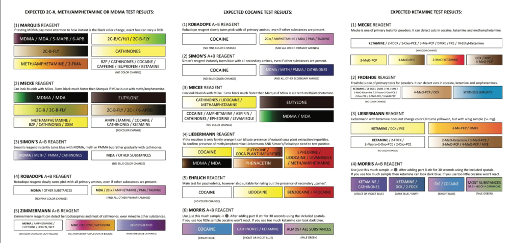 súprava na testovanie drog, test MDMA, test extázy, test s činidlom, test MDA, katinónový test, testovacie činidlo, Marquisov test, Simonov test, Zimmermannov test, Meckeho test, Robadope test