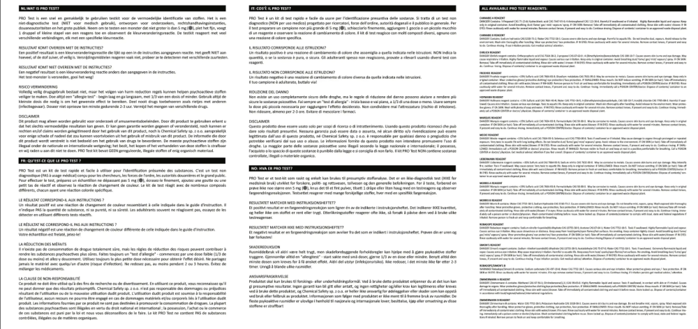 Súprava na testovanie MDMA je určená na pozitívnu identifikáciu MDMA, MDA a iných podobných látok. Súprava obsahuje päť činidiel, ktoré sú najvhodnejšie na testovanie MDMA, MDA, 2C-B a metamfetamínov. Tieto činidlá sú vhodné aj na testovanie benzofuránov, katinónov, opioidov a iných látok. Použitie tejto testovacej súpravy umožňuje vylúčiť prítomnosť nebezpečných a nežiaducich látok, ako sú katinóny, DXM, PMA/PMMA a iné, ktoré sú menej predvídateľné a vysoko toxické. viac
