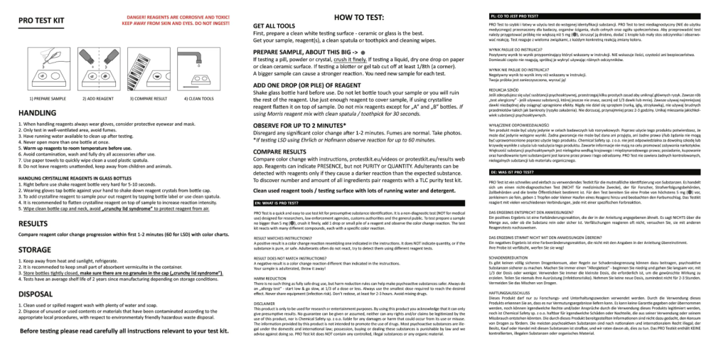 Súpravy na testovanie drog obsahujú chemikálie, ktoré sú toxické a/alebo žieravé a môžu spôsobiť popáleniny na pokožke a oblečení. Držte ich ďalej od očí a úst. Uchovávajte ich mimo dosahu detí a zvierat. Vždy ich používajte na dobre vetranom mieste. Noste rukavice a ochranné okuliare. Nikdy ich neukazujte do tváre ani nič podobné. Ak niečo postriekate alebo vylejete, okamžite sa umyte veľkým množstvom vody a mydla. Rozliate činidlo okamžite opláchnite tečúcou vodou a vyvetrajte priestor. Test skladujte vo zvislej polohe a mimo dosahu tepla na chladnom a tmavom mieste. Kvalita činidiel sa môže časom alebo kontaktom so vzduchom zhoršiť, najmä ak sú vystavené slnečnému žiareniu alebo nie sú uchovávané v chlade. Ak si nie ste istí, či činidlo stále funguje, otestujte ho na predtým overenej vzorke.